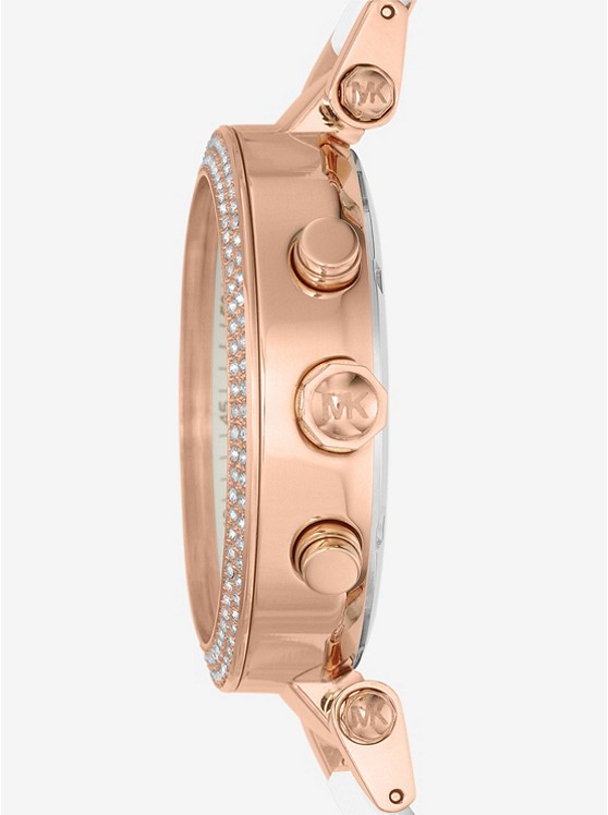 Maglie esterne lucide oro rosa fanno il pari con la maglia centrale in resina bianca per un elegante look bicolore Michael Kors.